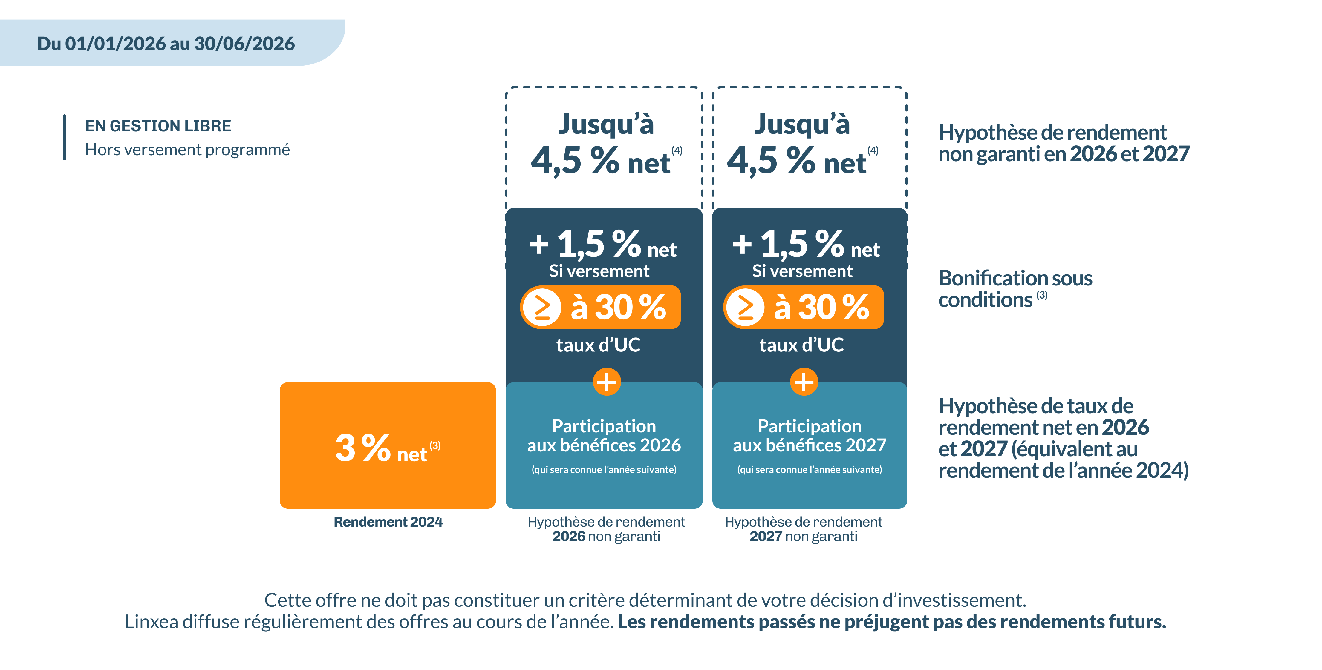 Pour tout versement réalisé, du 01/01/2026 au 30/06/2026, sur le fonds en euros Netissima : à condition de réaliser un versement avec 30% minimum en unités de compte (non garanties en capital) : bénéficiez d’une bonification de 1,50 net (2) sur le taux de rendement qui sera servi sur ce fonds en 2026 et 2027.