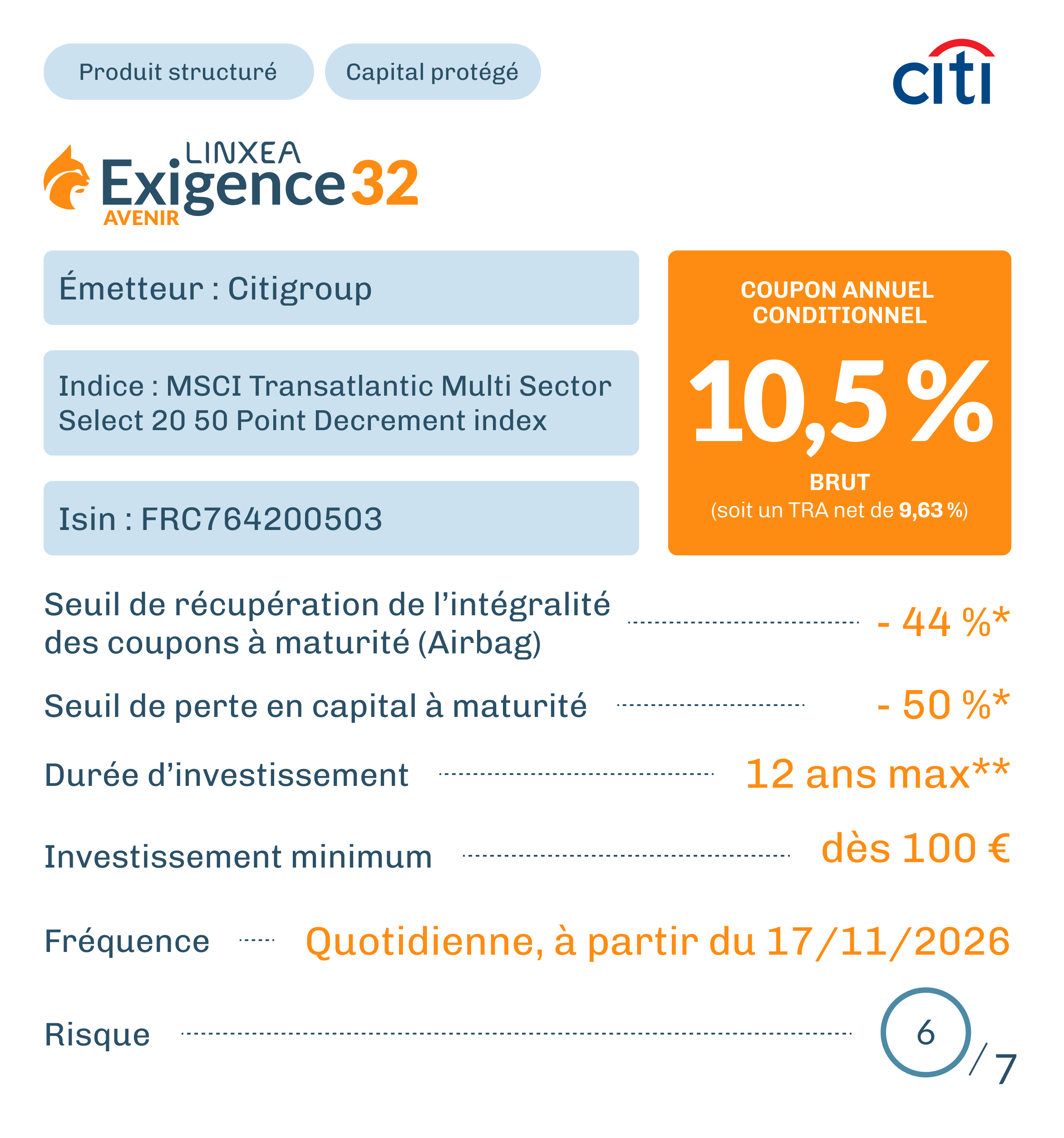 Exigence 32 Avenir est un instrument de diversification ne pouvant constituer l’intégralité d’un portefeuille d’investissement. Vous êtes sur le point d’acheter un produit qui n’est pas simple. Exigence 32 Avenir est un produit pouvant être difficile à comprendre et présentant un risque de perte en capital partiel ou total en cours de vie et à l’échéance. Ce produit est conçu en partenariat avec la société Irbis Solutions qui appartient au même groupe que Linxea.