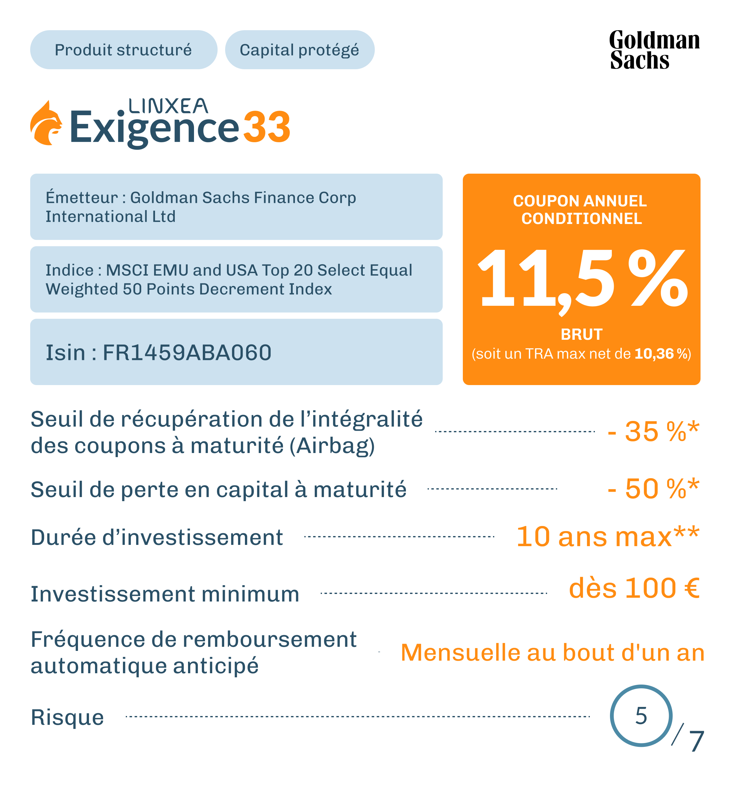 Exigence 33 est un instrument de diversification ne pouvant constituer l’intégralité d’un portefeuille d’investissement. Vous êtes sur le point d’acheter un produit qui n’est pas simple. Exigence 33 est un produit pouvant être difficile à comprendre et présentant un risque de perte en capital partiel ou total en cours de vie et à l’échéance. Ce produit est conçu en partenariat avec la société Irbis Solutions qui appartient au même groupe que Linxea.