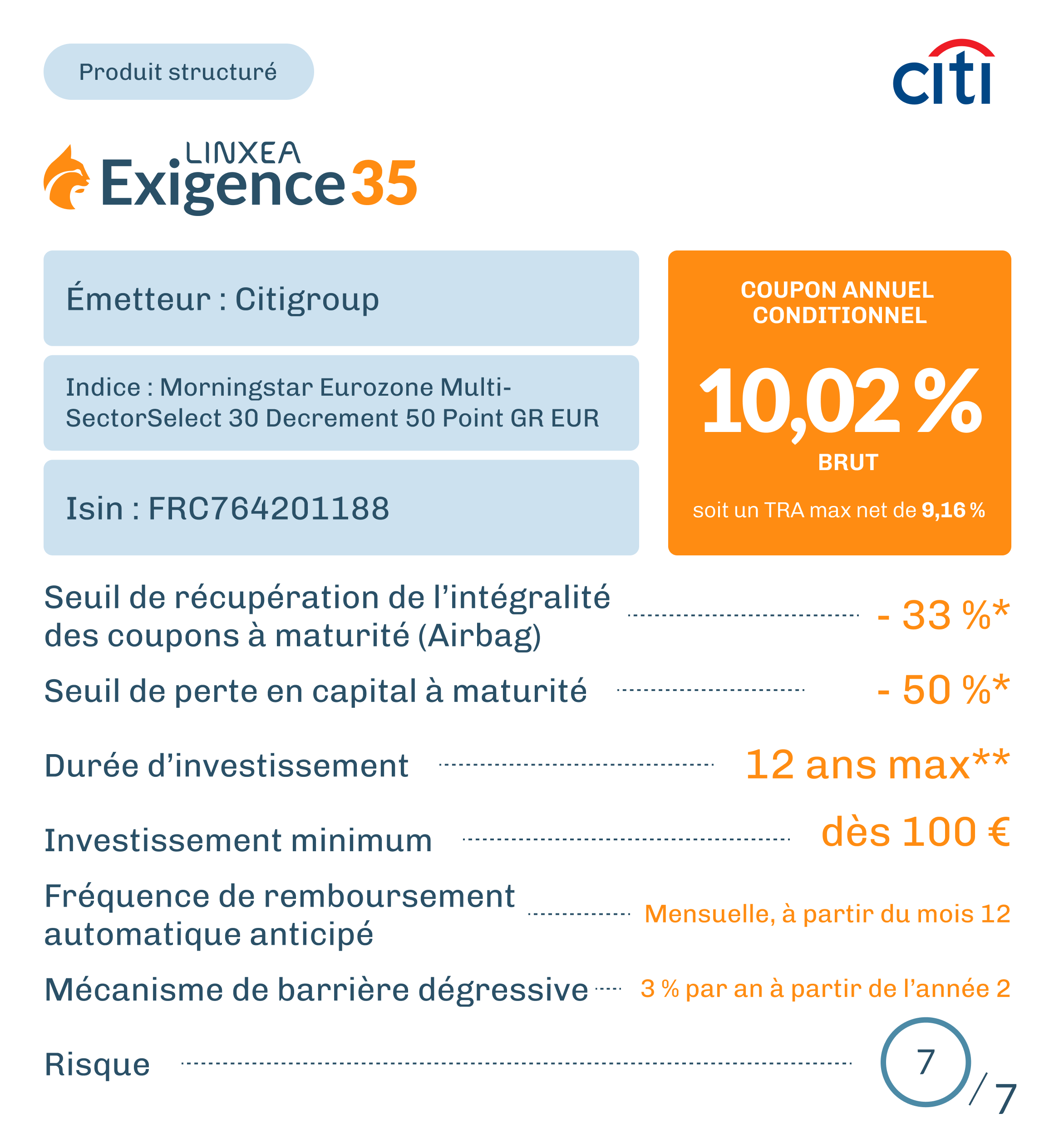 Exigence 35 est un instrument de diversification ne pouvant constituer l’intégralité d’un portefeuille d’investissement. Vous êtes sur le point d’acheter un produit qui n’est pas simple. Exigence 35 est un produit pouvant être difficile à comprendre et présentant un risque de perte en capital partiel ou total en cours de vie et à l’échéance. Ce produit est conçu en partenariat avec la société Irbis Solutions qui appartient au même groupe que Linxea.