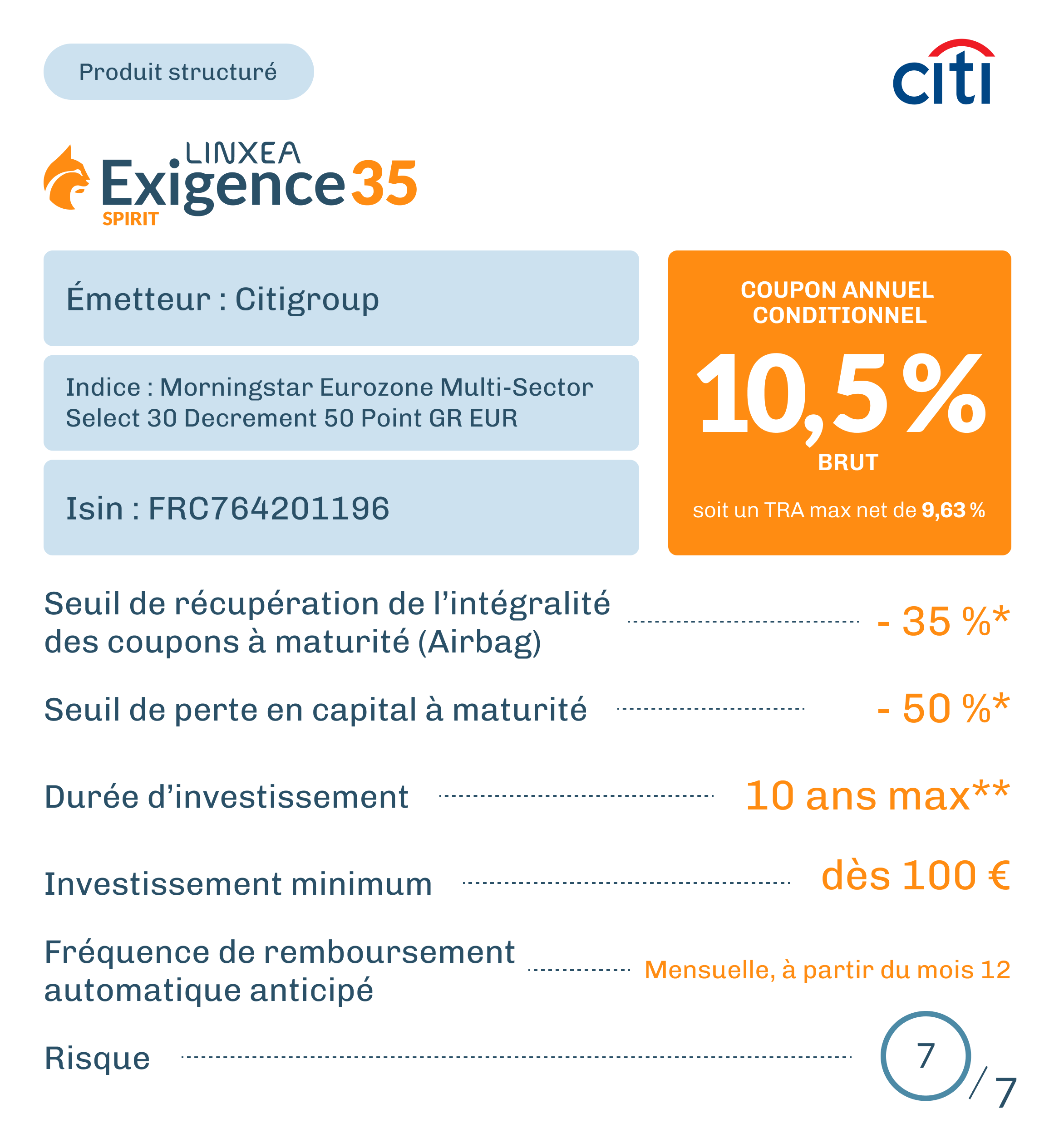 Exigence 35 Spirit est un instrument de diversification ne pouvant constituer l’intégralité d’un portefeuille d’investissement. Vous êtes sur le point d’acheter un produit qui n’est pas simple. Exigence 35 Spirit est un produit pouvant être difficile à comprendre et présentant un risque de perte en capital partiel ou total en cours de vie et à l’échéance. Ce produit est conçu en partenariat avec la société Irbis Solutions qui appartient au même groupe que Linxea.