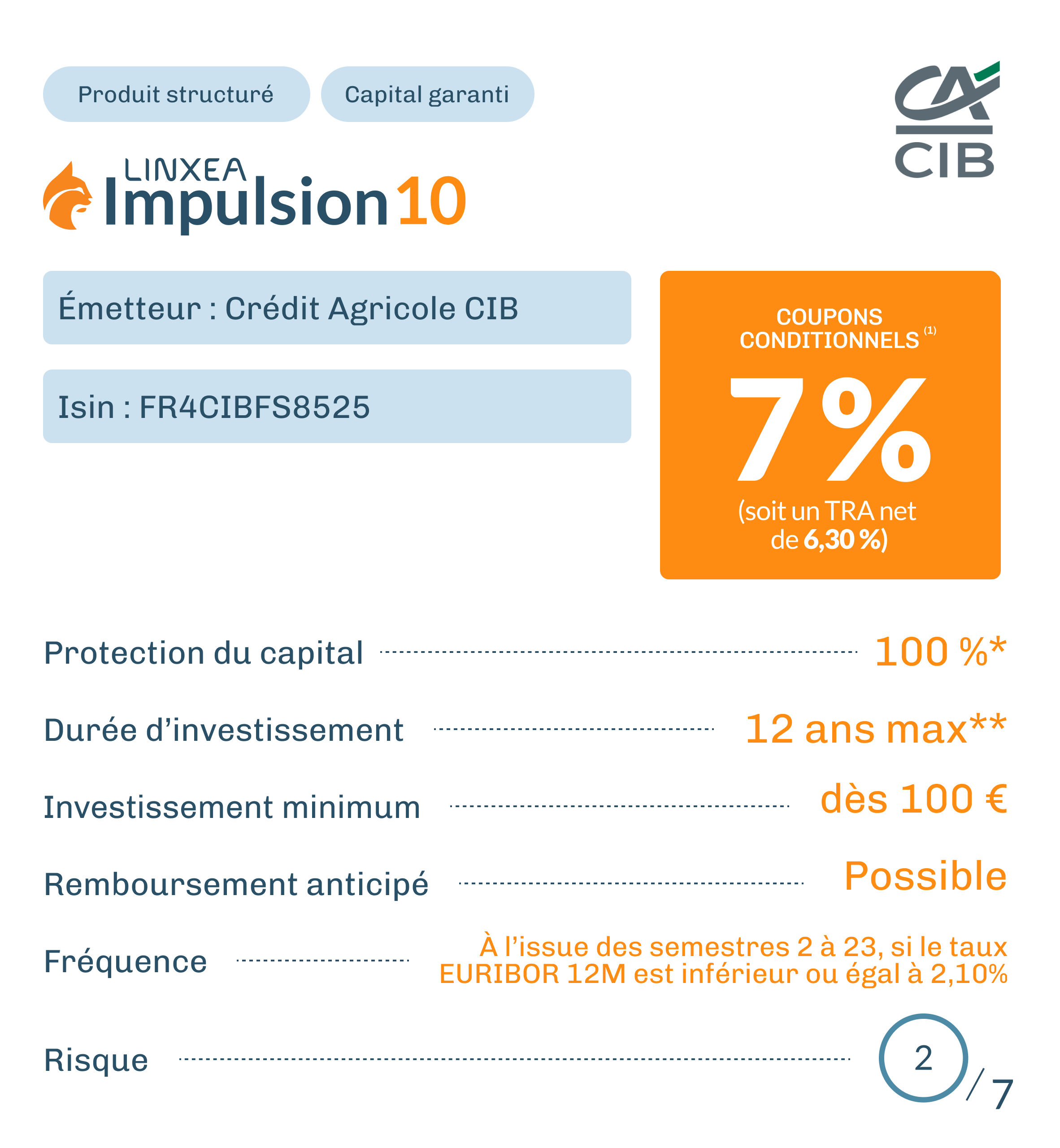 Impulsion 10 est un instrument de diversification ne pouvant constituer l’intégralité d’un portefeuille d’investissement. Vous êtes sur le point d’acheter un produit qui n’est pas simple. Impulsion 10 est un produit pouvant être difficile à comprendre et présentant un risque de perte en capital partiel ou total en cours de vie et à l’échéance. Ce produit est conçu en partenariat avec la société Irbis Solutions qui appartient au même groupe que Linxea.