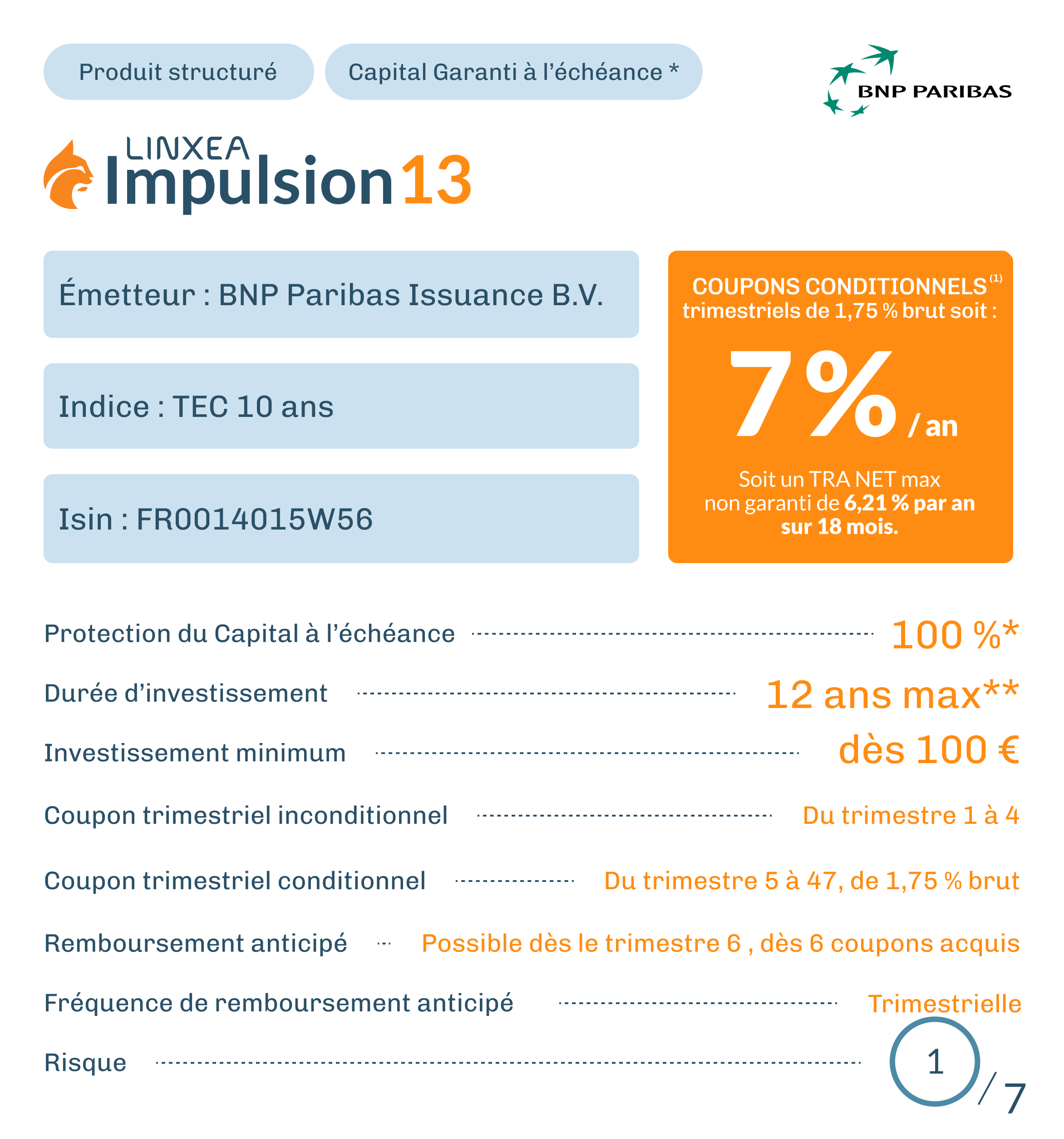 Impulsion 13 est un instrument de diversification ne pouvant constituer l’intégralité d’un portefeuille d’investissement. Vous êtes sur le point d’acheter un produit qui n’est pas simple. Impulsion 13 est un produit pouvant être difficile à comprendre et présentant un risque de perte en capital partiel ou total en cours de vie et à l’échéance. Ce produit est conçu en partenariat avec la société Irbis Solutions qui appartient au même groupe que Linxea.