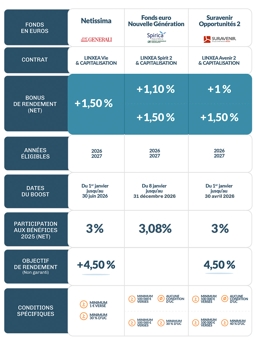 Cette offre est disponible sur le fonds euro Nouvelle Génération quelque soit le contrat (hors PER) : Linxea Spirit, Linxea Spirit Capitalisation, Linxea Spirit 2 et Linxea Spirit Capitalisation 2.